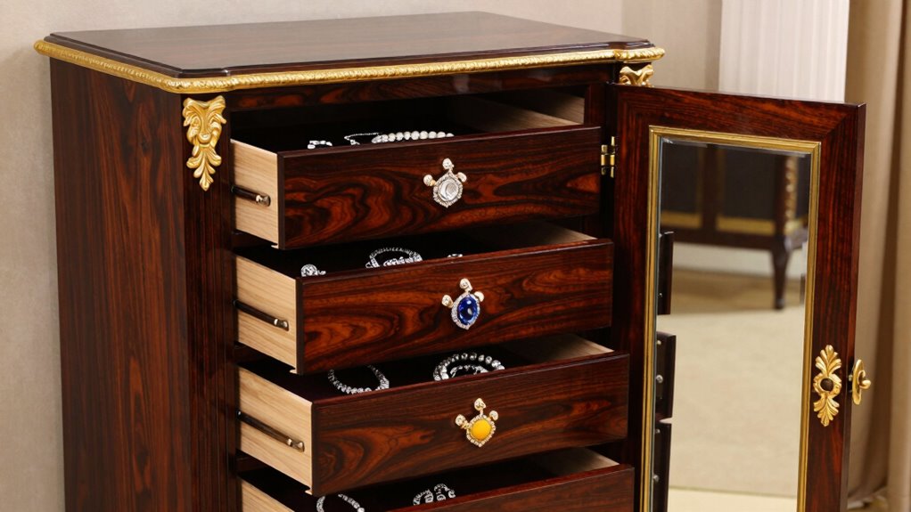 A well-designed jewelry armoire should prioritize ease of access, making it simple to find and retrieve your pieces quickly. It should feature a well-organized layout with compartments that allow for swift selection, such as designated sections or labeled areas for different jewelry types. Built-in mirrors and open-top lids can make dressing and jewelry application effortless. Adjustable or removable hooks and shelves help accommodate various jewelry sizes and styles, enhancing convenience. The placement of drawers and doors is essential; they should open smoothly without obstruction from other parts, providing easy reach from different angles. Clear labeling or dedicated sections further streamline the process, allowing you to quickly identify and access your jewelry without hassle.
